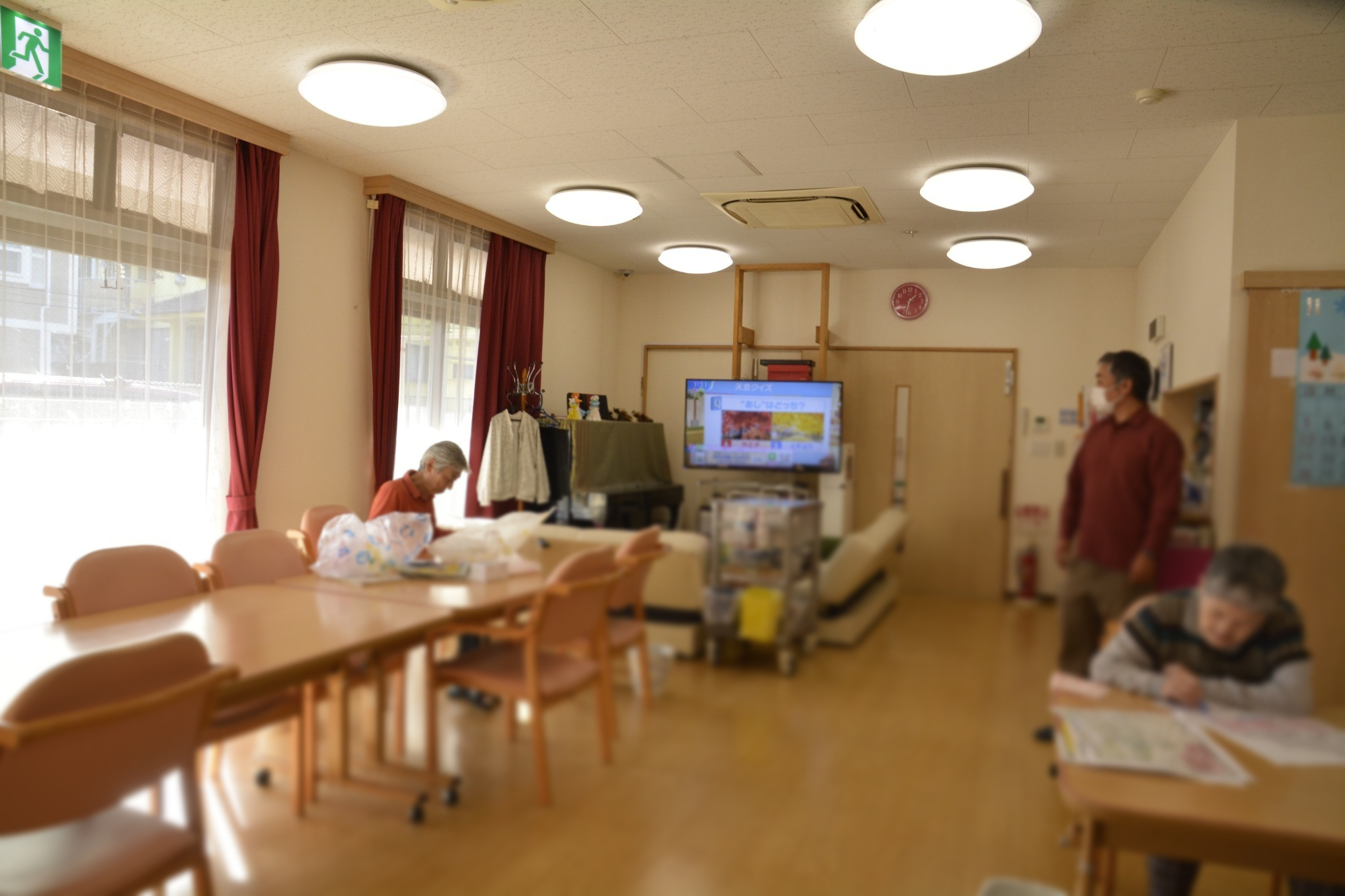 デイサービス、ヘルパーサービス、お泊まりサービスを備えた小規模多機能施設です。
